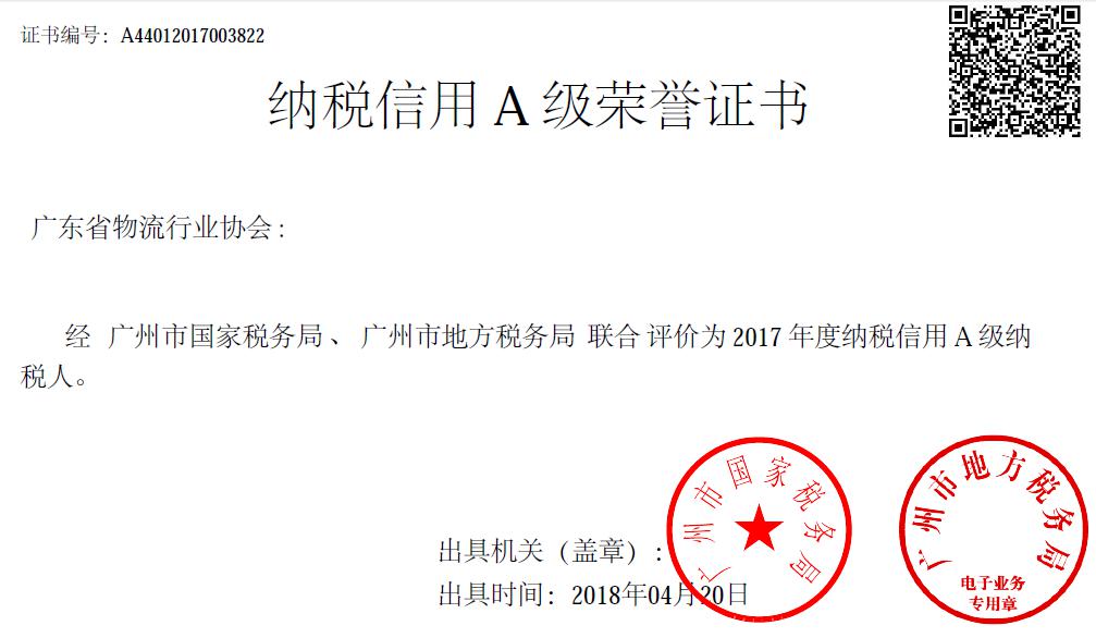 为促进依法诚信纳税,进一步优化税收营商环境,按照国家税务总局和广东省国家税务局的统一部署,广州市国家税务局已完成2017年度纳税信用评价工作。广东省物流行业协会获评2017年度纳税信用A级纳税人。