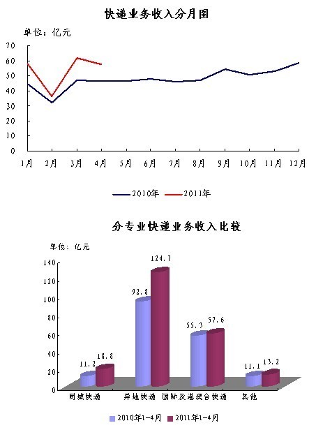 4月份,快递业务量完成2.8亿件,同比增长54.0%;业务收入完成57.6亿元,同比增长24.2%。