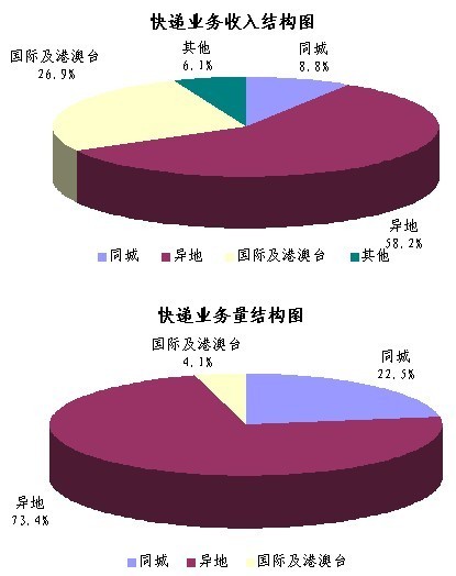 1-4月,同城、异地、国际及港澳台快递业务收入分别占全部快递收入的8.8%、58.2%和26.9%;业务量分别占全部快递业务量的22.5%、73.4%和4.1%。与去年同期相比,同城快递业务收入的比重上升2.2个百分点,异地快递业务收入的比重上升3.8个百分点,国际及港澳台业务收入的比重下降了5.6个百分点。
