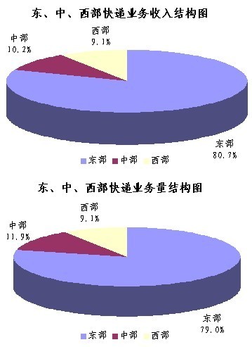1-4月,东、中、西部地区快递业务收入的比重分别为80.7%、10.2%和9.1%,业务量比重分别为79.0%、11.9%和9.1%。与去年同期相比,东部地区快递业务收入比重下降了0.7个百分点,快递业务量比重下降了1.7个百分点;中部地区快递业务收入比重上升了0.4个百分点,快递业务量比重上升了1.7个百分点;西部地区快递业务收入比重上升了0.3个百分点,快递业务量比重与去年同期持平。