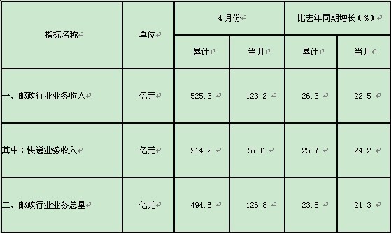 4月份,全行业业务收入完成123.2亿元,同比增长22.5%;业务总量完成126.8亿元,同比增长21.3%。