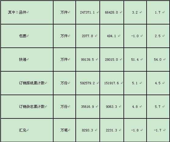 1-4月,邮政函件业务累计完成24.7亿件,同比增长3.2%;包裹业务累计完成2077.8万件,同比下降1%;报纸业务累计完成59.3亿份,同比增长5.1%;杂志业务累计完成3.6亿份,同比增长4.8%;汇兑业务累计完成8293.3万笔,同比下降1.8%。