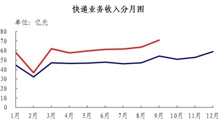 9月份,快递业务量完成3.2亿件,同比增长50.7%;业务收入完成71亿元,同比增长30.6%。