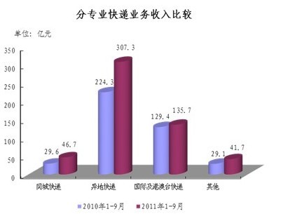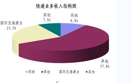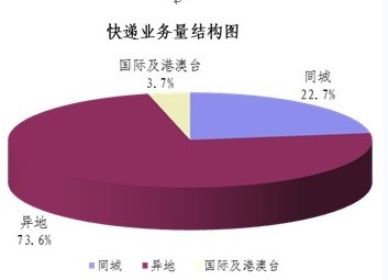 1-9月,同城、异地、国际及港澳台快递业务收入分别占全部快递收入的8.8%、57.8%和25.5%;业务量分别占全部快递业务量的22.7%、73.6%和3.7%。同城快递业务收入的比重上升1.6个百分点,异地快递业务收入的比重上升3.4个百分点,国际及港澳台业务收入的比重下降了5.9个百分点。