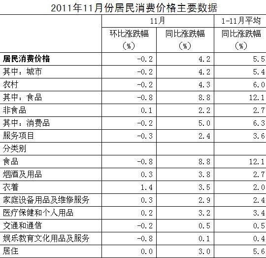 2011年11月份,全国居民消费价格总水平同比上涨4.2%。其中,城市上涨4.2%,农村上涨4.3%;食品价格上涨8.8%,非食品价格上涨2.2%;消费品价格上涨5.0%,服务项目价格上涨2.4%。全国居民消费价格总水平环比下降0.2%。其中,城市下降0.2%,农村下降0.2%;食品价格下降0.8%,非食品价格上涨0.1%;消费品价格下降0.2%,服务项目价格下降0.3%。1-11月平均,全国居民消费价格总水平比去年同期上涨5.5%。