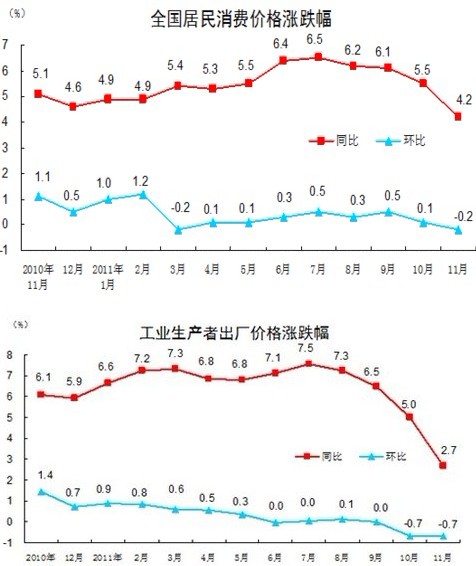 2011年11月份,全国工业生产者出厂价格(PPI)同比上涨2.7%,环比下降0.7%。工业生产者购进价格同比上涨5.1%,环比下降0.7%。2011年1—11月平均,工业生产者出厂价格同比上涨6.4%,工业生产者购进价格同比上涨9.7%。