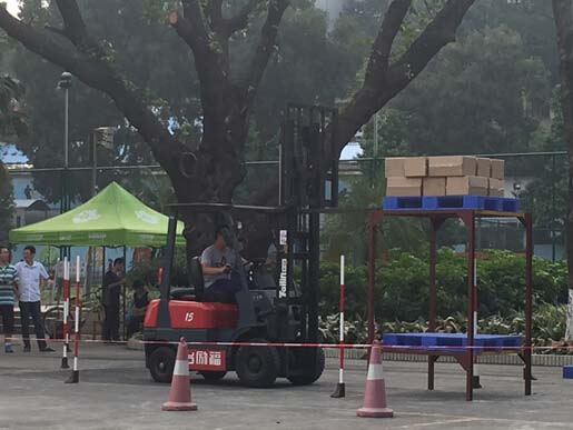 来自广东省企业和院校共54组参赛单位的职工、教师和学生选手们、领队、指导老师(共200人)有条不紊的按照大赛组委会安排好的时间进行现代进出库和叉车场地的熟悉及操练,市机电的老师及工作人员对到场选手的耐心讲解也获得一致的好评!